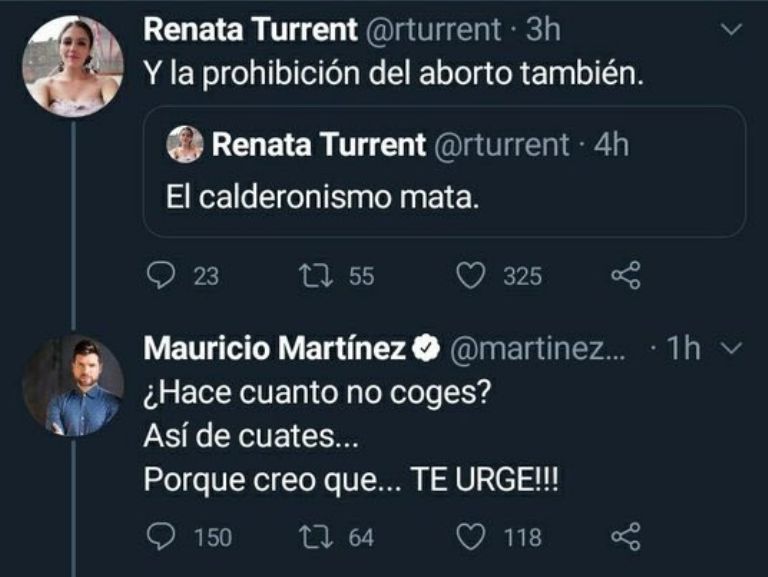 La usuaria Renata Turret se pronunció a favor de la interrupción legal del embarazo y dijo que la prohibición del aborto mata, a lo que el histrión respondió y causó la molestia de los usuarios.