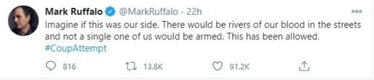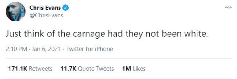 Tras todo lo ocurrido, algunas celebridades no tardaron en compartir sus pensamientos en redes, debido a que las cosas siguen tensas aún y ya han perdido la vida cuatro personas. Además que se ha reportado que hay 52 detenidos hasta el momento. Uno de ellos fue el actor Chris Evans, quien usualmente suele reprochar todo lo que hace Trump, declaró que estaba sin palabras y si hubiesen sido afroamericanos, las cosas fuesen totalmente diferentes.