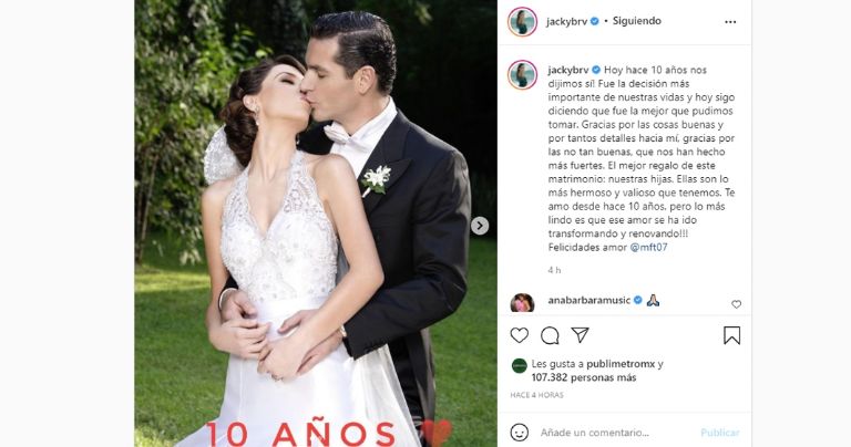Hace 10 años llegaste a cambiar y llenar de luz mi vida. Los últimos 10 años han sido los más felices de mi vida. Gracias por el tiempo, la paciencia, las enseñanzas que he recibido de ti y principalmente las 5 hermosas princesas que hemos criado juntos. Hoy hace 10 años, dos corazones se volvieron uno, atravesamos buenos y malos momentos, y lo más importante es que juntos creamos momentos inolvidables. TE AMO HOY Y SIEMPRE @jackybrv", escribió en un post.