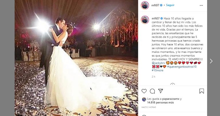 ¡Hoy hace 10 años nos dijimos sí! Fue la decisión más importante de nuestras vidas y hoy sigo diciendo que fue la mejor que pudimos tomar. Gracias por las cosas buenas y por tantos detalles hacia mí, gracias por las no tan buenas, que nos han hecho más fuertes. El mejor regalo de este matrimonio: nuestras hijas. Ellas son lo más hermoso y valioso que tenemos. Te amo desde hace 10 años, pero lo más lindo es que ese amor se ha ido transformando y renovando Felicidades amor @mft07".