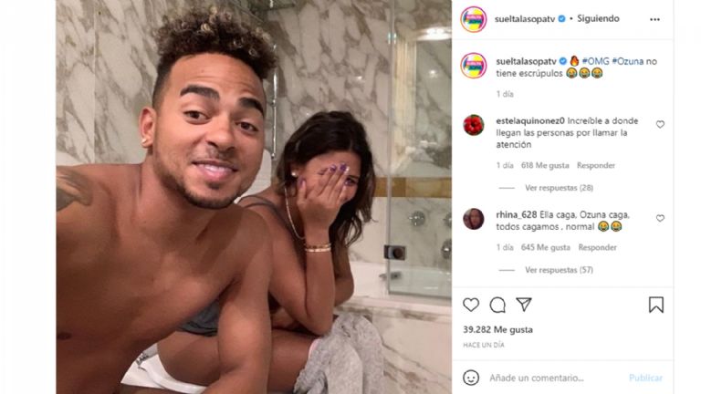 En la imagen, Ozuna apare junto a su esposa Tania Marie Meléndez, quien se cubre la cara pues se encuentra semidesnuda mientras está sentada en el inodoro.