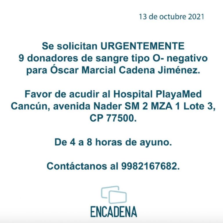 Amig@s, solicitamos urgentemente sangre O- negativo para Oscar Marcial Cadena Jiménez en #Cancún. Favor de acudir al Hospital PlayaMed, Cancún, avenida Nader SM 2 MZA 1 Lote con 4 a 8 horas de ayunas", escribieron en la cuenta de Facebook del presentador.
