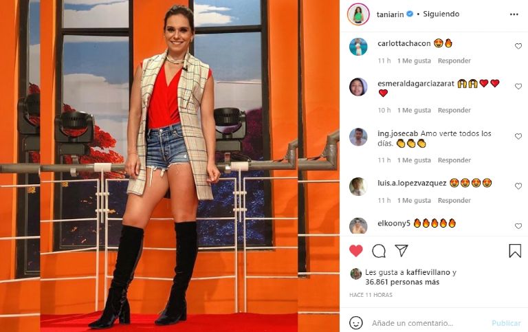 En la imagen que compartió se puede ver a Tania posando con un coqueto y corto short de mezclilla que combinó con una blusa naranja, un chaleco beige con estampado de cuadros, botas negras y el cabello sujeto en una coleta.