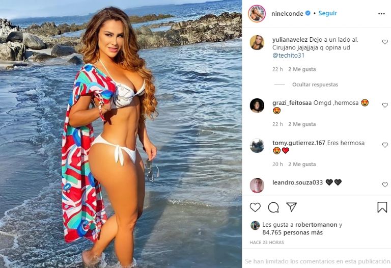 Conde compartió una instantánea en la que aparece posando en la orilla de la playa y luciendo un seductor bañador de color blanco. La artista contó a sus seguidores que su secreto de belleza es hacer ejercicio, comer bien, darse masajes y tomar suplementos, pero muchos creen que le faltó mencionar "las cirugías".