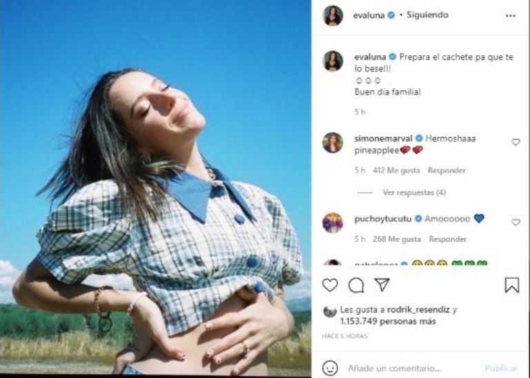 Evaluna empleó hace una hora su perfil de Instagram para compartir una tierna instantánea en la que posa tocando su vientre y le dedica una línea de la canción.