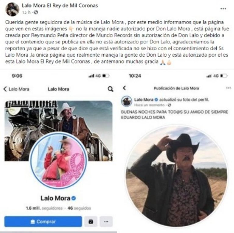 Querida gente seguidora de la música de Lalo Mora , por este medio informamos que la página que ven en estas imágenes no la maneja nadie autorizado por Don Lalo Mora , está página fue creada por Reymundo Peña director de Mundo Records sin autorización de Don Lalo y debido a que el contenido que se publica en ella no está autorizado por Don Lalo, agradeceríamos la reporten ya que a pesar de que dice que está verificada no se hizo con el consentimiento del Sr. Lalo Mora ,la única página que realmente maneja la gente de Don Lalo y está autorizada por el es esta 'Lalo Mora El Rey de Mil Coronas' , de antemano muchas gracias", se lee.