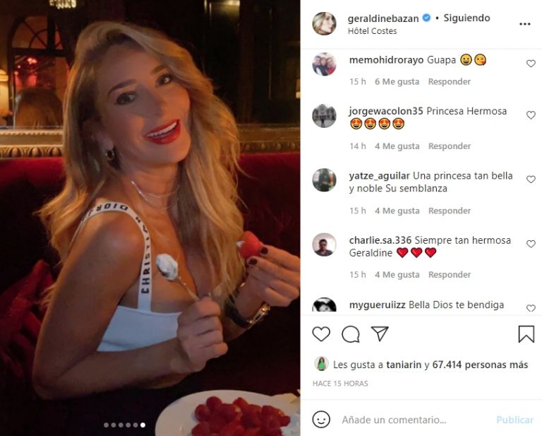 Durante la tarde de ayer jueves 21 de octubre, Geraldine aprovechó su cuenta oficial de Instagram para compartir nuevas fotografías de su viaje. La actriz posó desde un restaurante mientras disfruta de unas fresas con crema mientras modela un top blanco Christian Dior con accesorios dorados, el cabello con ondas y los labios pintados de rojo.