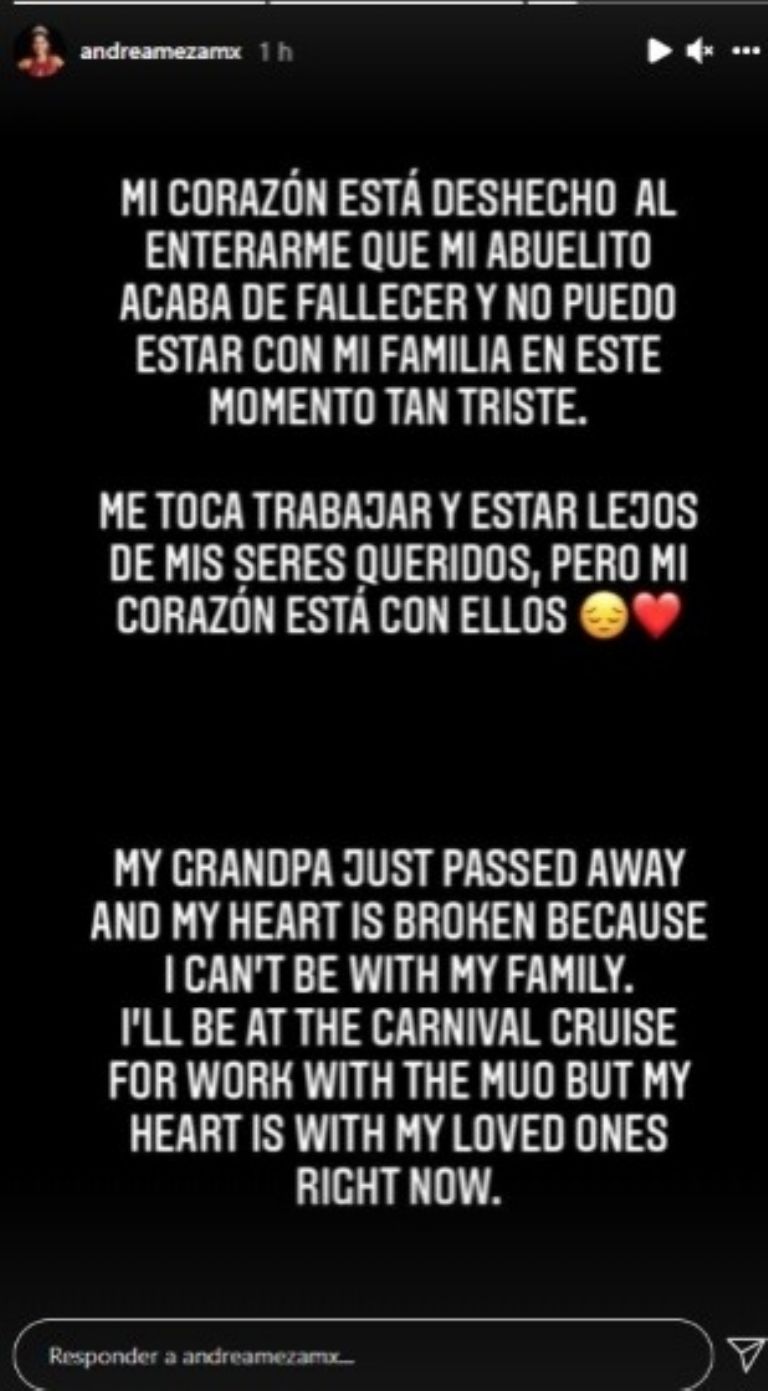 Con un desgarrador mensaje, la chihuahuense informó que su abuelo había fallecido y dijo estar muy triste por estar tan lejos de casa y no poder estar junto a su familia en este terrible momento.