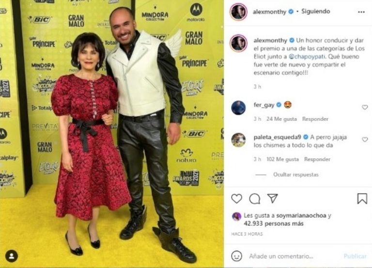 Un honor conducir y dar el premio a una de las categorías de Los Eliot junto a @chapoypati. Qué bueno fue verte de nuevo y compartir el escenario contigo", escribió.