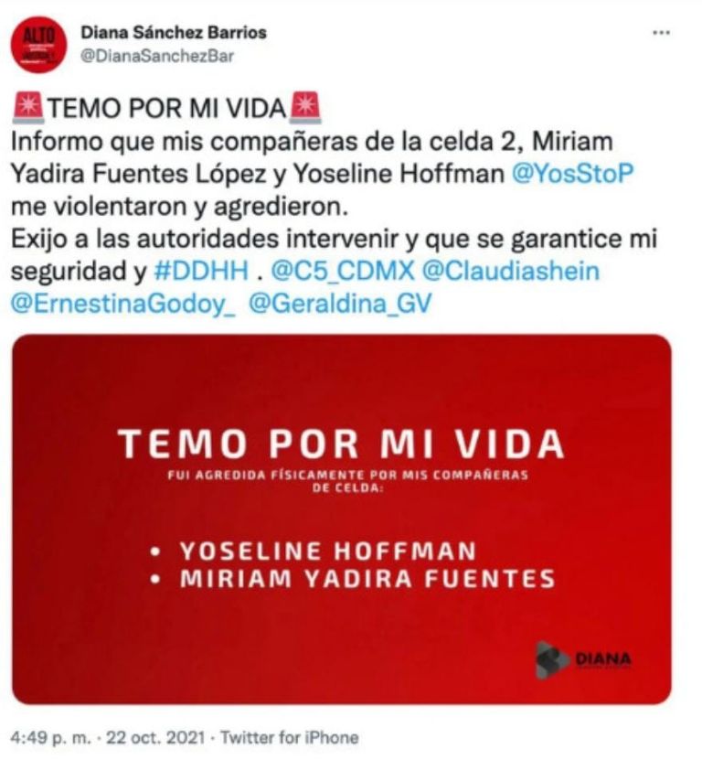 Diana Sánchez Barrios, lideresa de comerciantes ambulantes del Centro Histórico, informó a través de su cuenta de Twitter que YosStop y su otra compañera de celda la atacaron y violentaron y por ello teme por su vida.