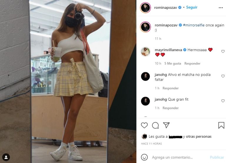 Se trata de una selfie que Romina se sacó en el espejo y en la que se deja ver presumiendo su envidiable figura. Lució un top blanco que permitió ver su marcado abdomen además de que llevó una coqueta faldita amarilla y tenis blancos, así como el cabello lacio.