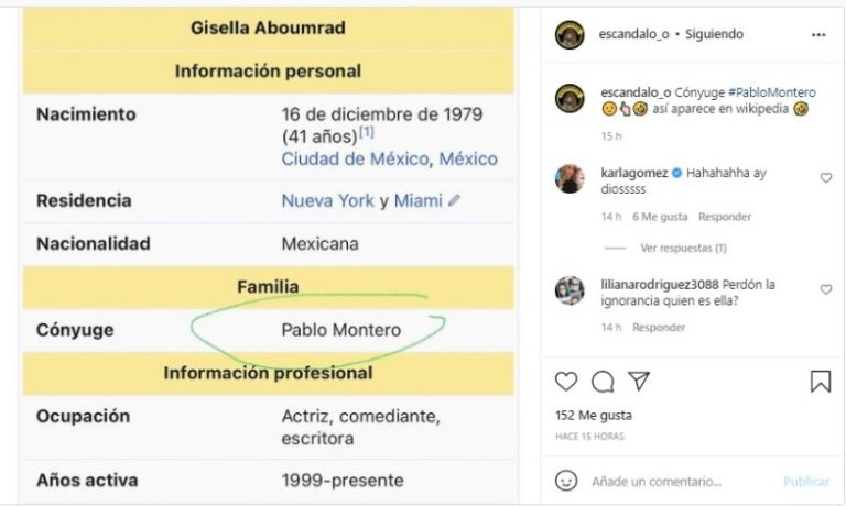 A través del perfil de Instagram de la página de chismes @escandalo_o se filtró una captura de pantalla de la página de Wikipedia en la que Pablo Montero aparece como cónyuge en la biografía de Gisella.