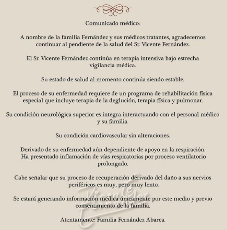 Asimismo, explicaron que el padre de los cantantes Alejandro Fernández y Vicente Fernández Jr. aún se encuentra en terapia intensiva bajo estrecha vigilancia médica, pero que su estado de salud continúa siendo estable.