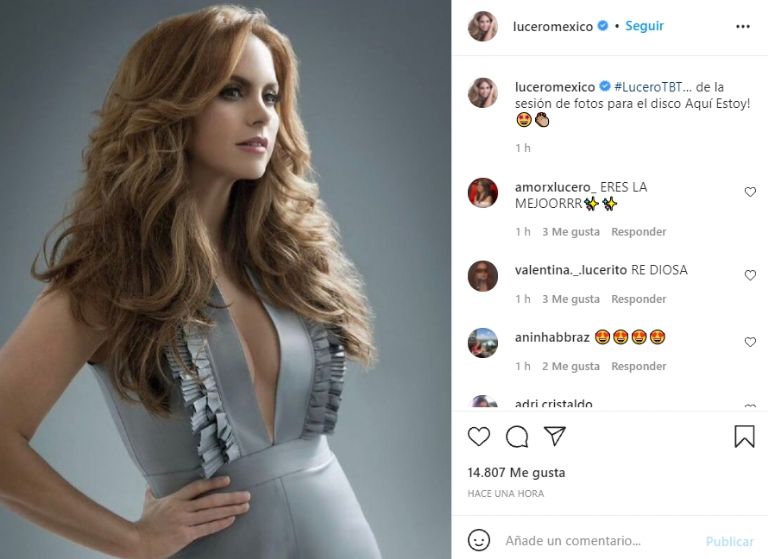 En la imagen tomada desde 2014 para su disco Aquí Estoy se puede ver a Lucero posando con un coqueto vestidito color gris con pronunciado escote que resalta su perfecta anatomía, el cabello teñido de un castaño oscuro y maquillaje que la hace ver espectacular.