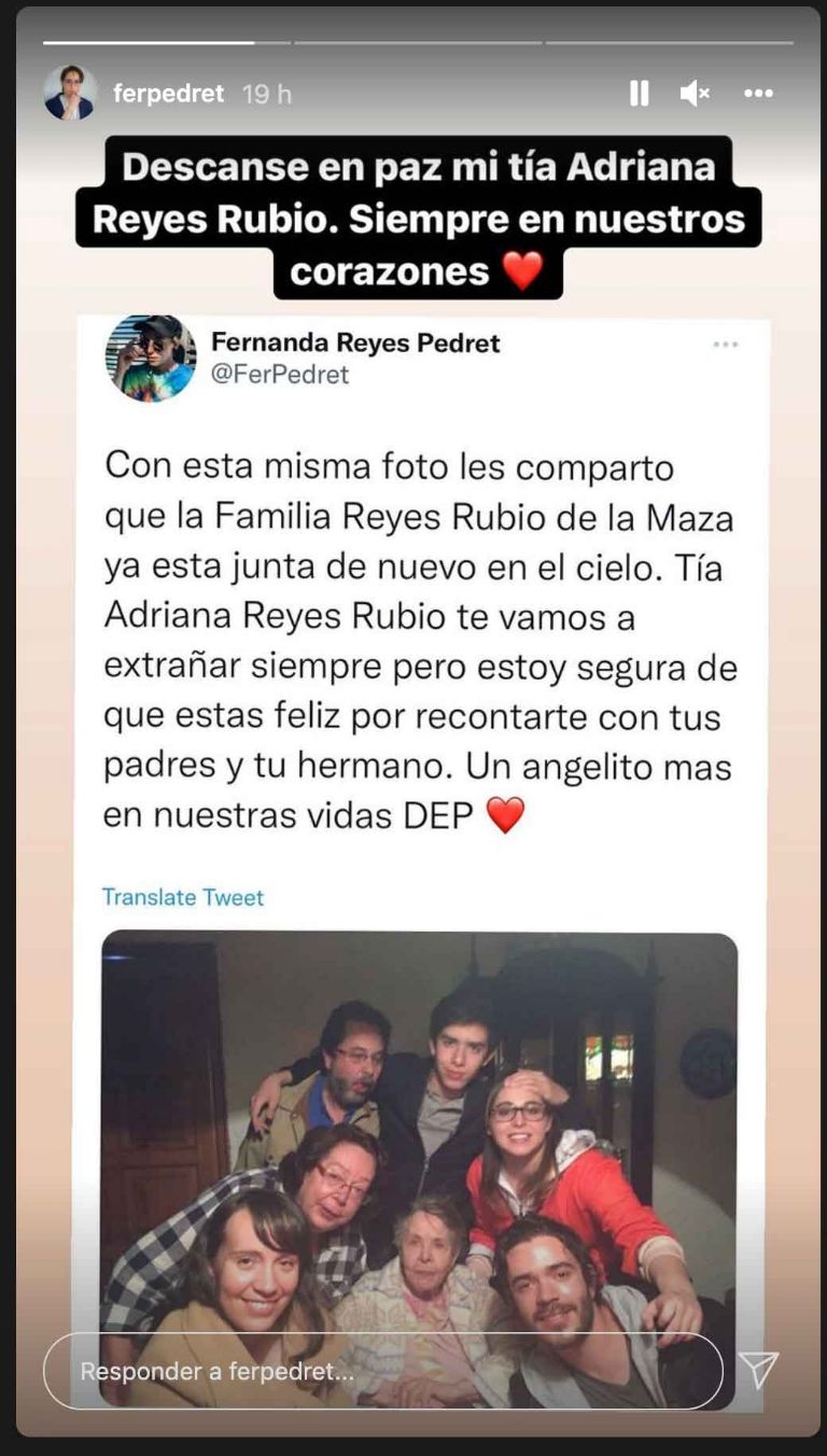 Descansa en paz mi tía Adriana Reyes Rubio. Siempre en nuestros corazones", publicó al informar sobre la triste noticia.
