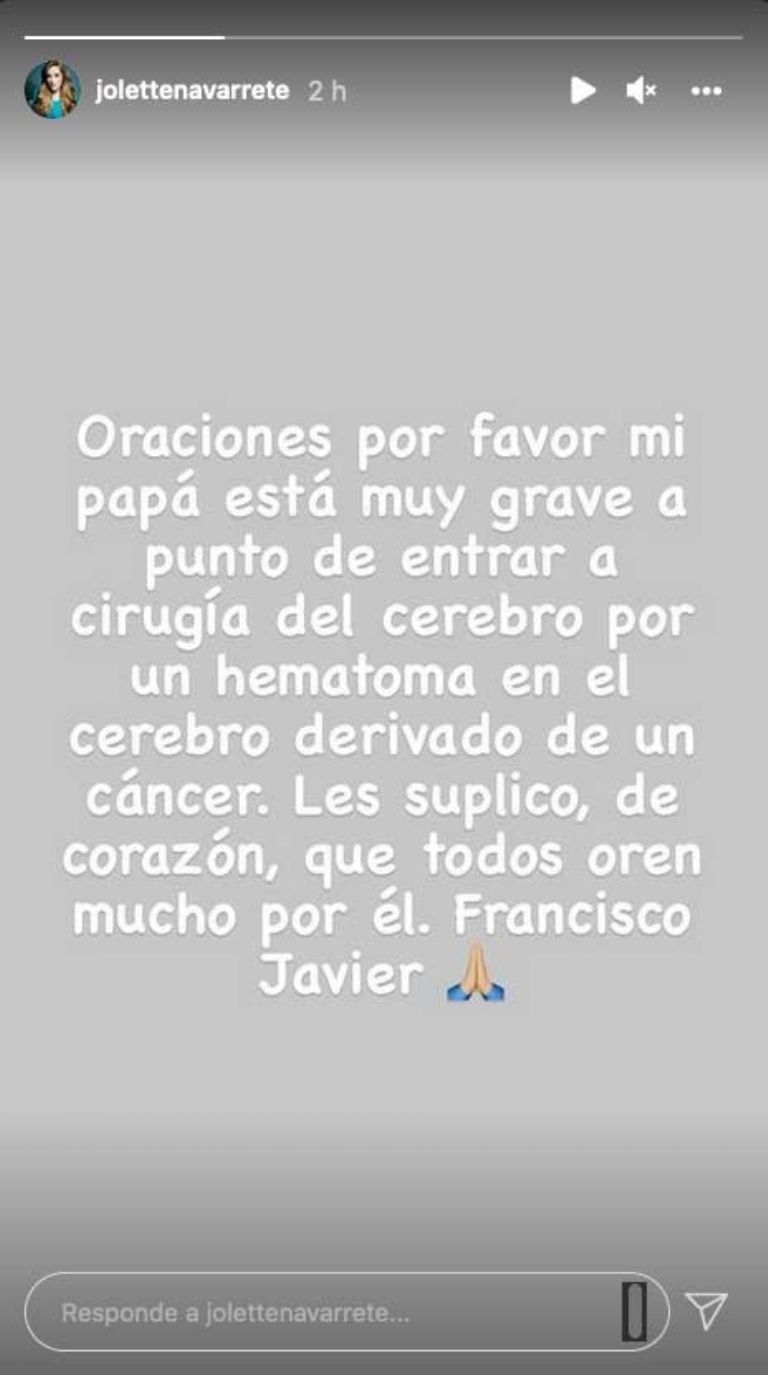Oraciones por favor, mi papá está muy grave a punto de entrar a cirugía del cerebro por un hematoma en el cerebro, derivado de un cáncer. Les suplico, de corazón, que todos oren mucho por él. Francisco Javier", escribió Jolette.