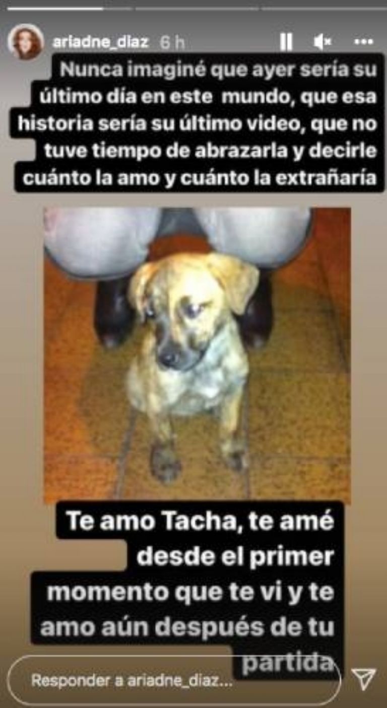 A través de sus historias de Instagram, la estrella de Televisa compartió un video y un par de fotografías donde, devastada, dio la triste noticia. En las imágenes muestra a su perra Tacha, quien falleció ayer miércoles.