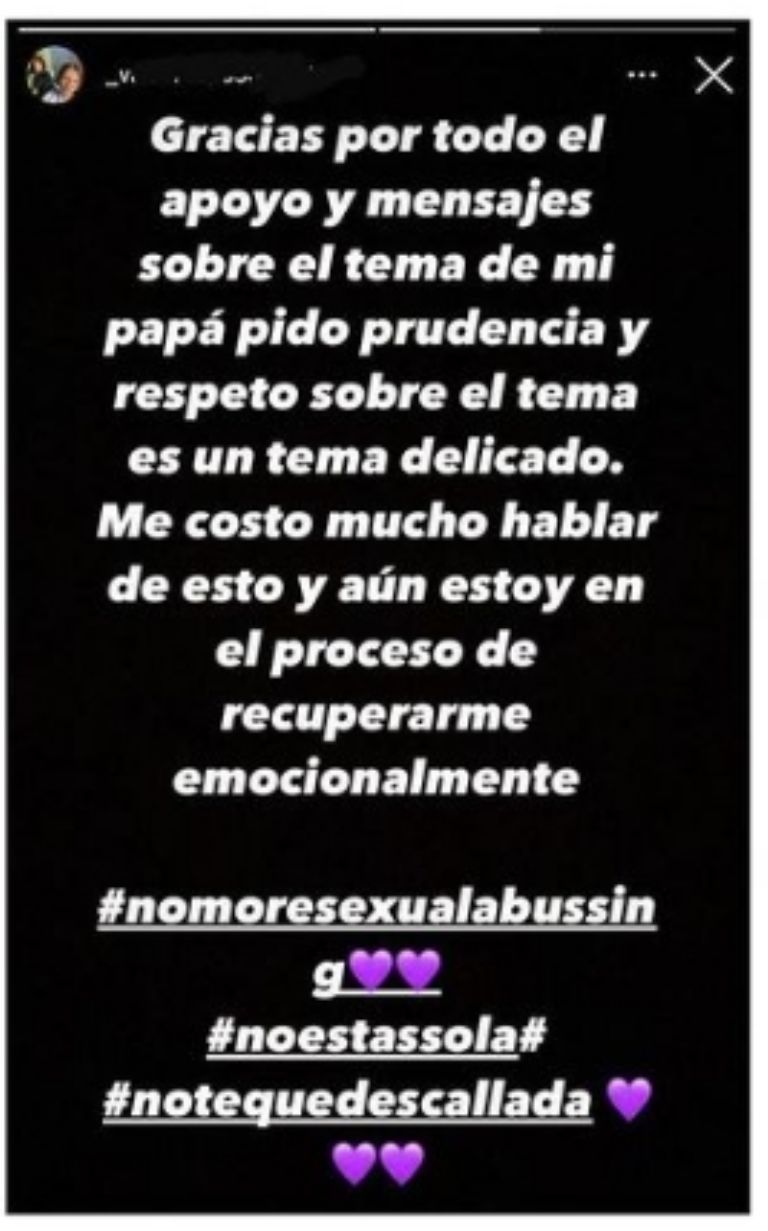 "Gracias por todo el apoyo y mensajes sobre el tema de mi papá, pido prudencia y respeto sobre el tema, es un tema delicado", escribió en una publicación a través de sus historias de Instagram.
