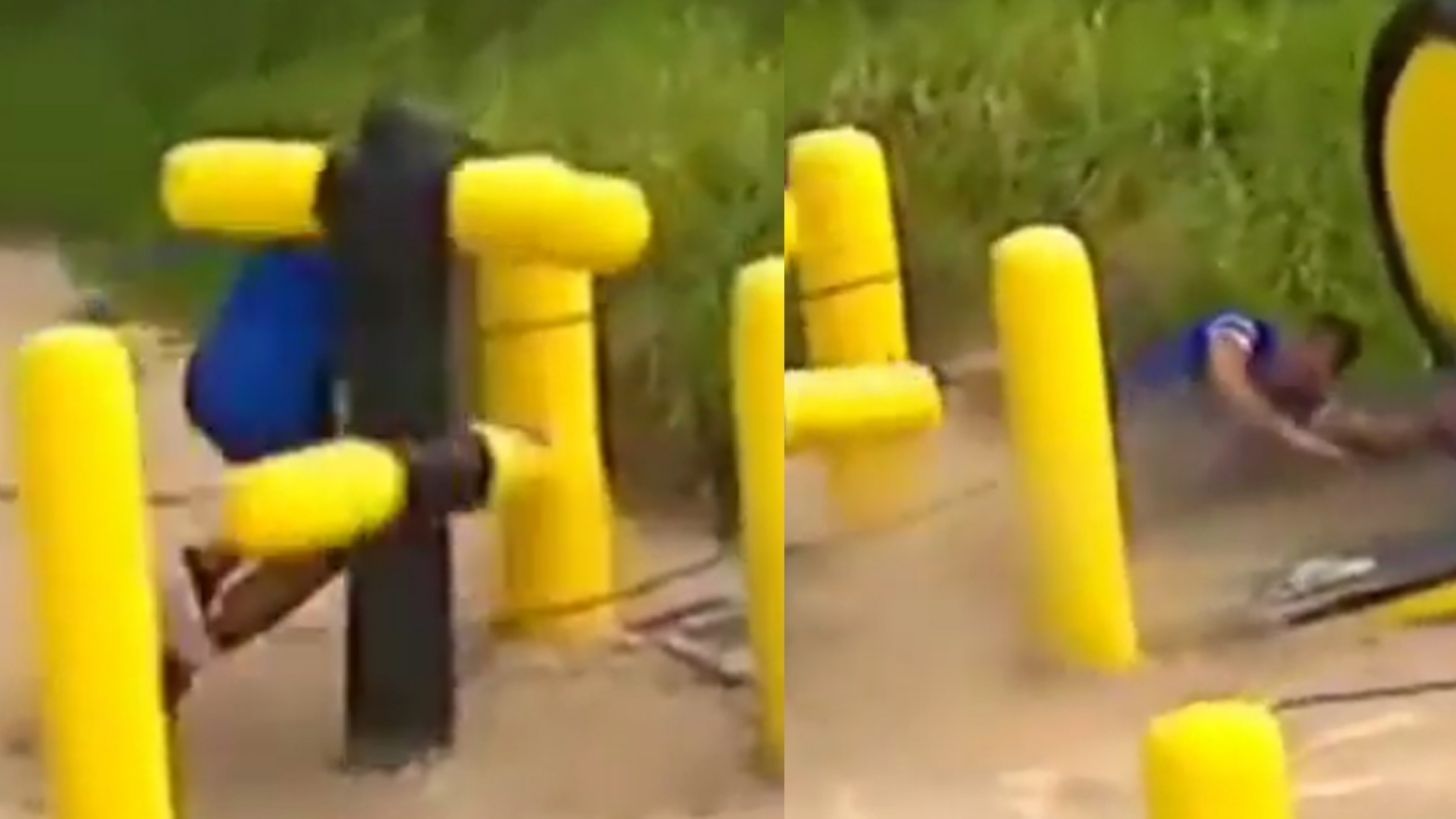 En el video compartido por varias redes de memes, se puede ver como 'Yomi' trata de seguirle el paso al 'Aguileón', pero al pasar en una estructura giratoria, su cuerpo impacta con uno de los tubos, pierde el control y terminó cayendo de costalazo en el suelo.