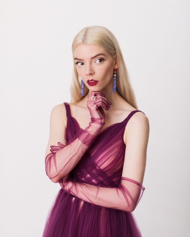 La ganadora del galardón a mejor actriz en miniserie (por Gambito de Dama) lució un vestido morado de Dior Haute Couture de gasa con guantes a juego y joyas de Bulgari.