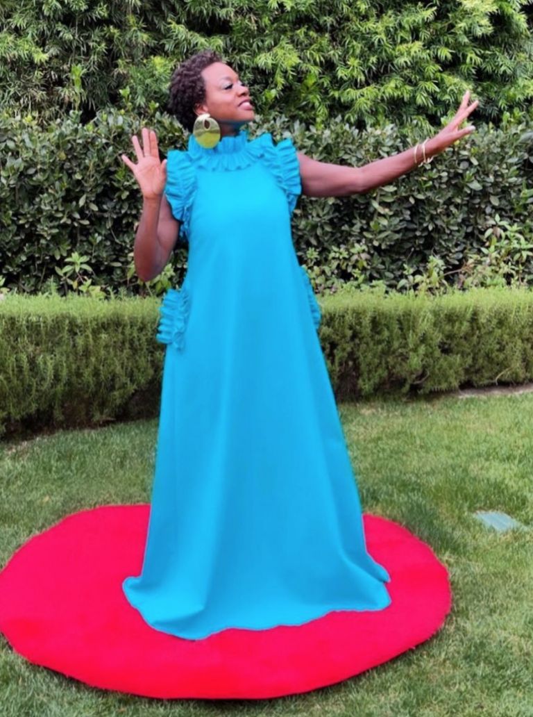 La ganadora a mejor actriz por Ma Rainey’s Black Bottom, lució un vestido azul de Greta Constantine.