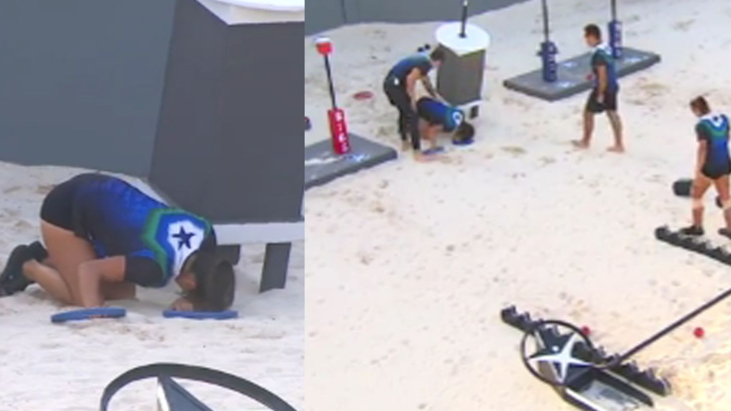 Ante esto, a 'Corazón Valiente' le tocó lanzar mientras Guijarro iba por sus aros, momento en el que uno de los objetos golpeó en la pierna de su compañera, pero lo que la hizo detenerse fue que la hizo perder el equilibrio y se dobló el pie.