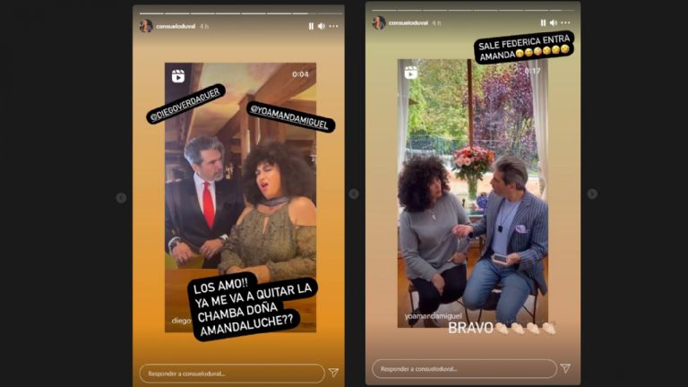 Hace unas horas, Consuelo apareció nuevamente en sus instastories, esta vez para difundir un par de videos cortos donde aparece la pareja de cantantes, Amanda Miguel y Diego Verdaguer, parodiando dos escenas de la famosa serie mexicana de Televisa, La Familia Peluche.
