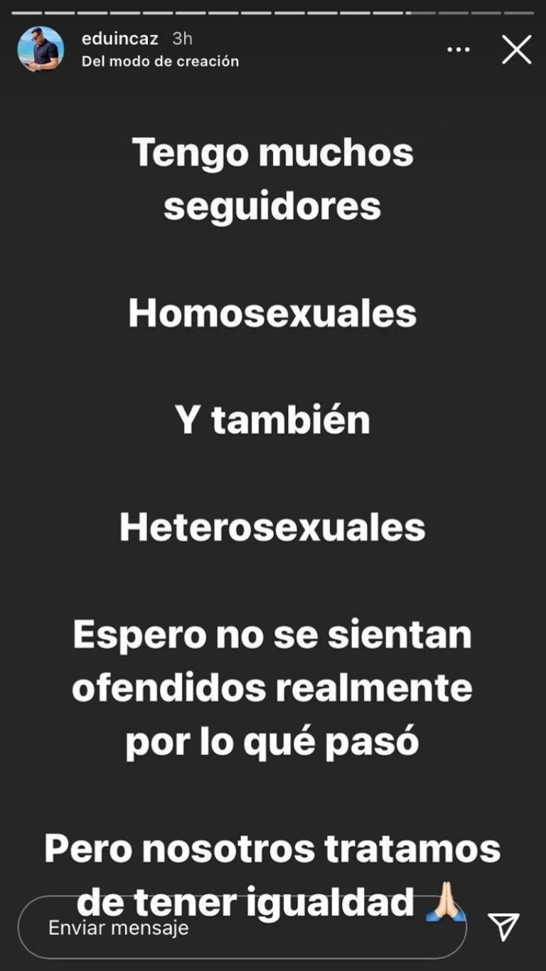 Tras la serie de comentarios y especulaciones de muchos seguidores indignados por tal acción, Eduin aclaró la situación y envió un mensaje a quienes se sintieron ofendidos.