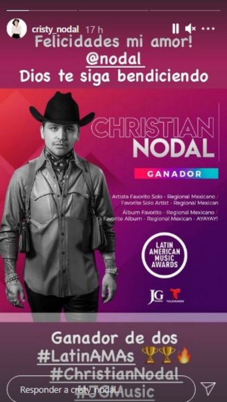 Por medio de redes sociales es donde la mamá de Christian Nodal se mostró respecto a lo sucedido durante la noche del jueves y los premios que ganó su hijo, por lo que agregó: "Nodal ganador de dos #LatinAMAs ¡Felicidades!".