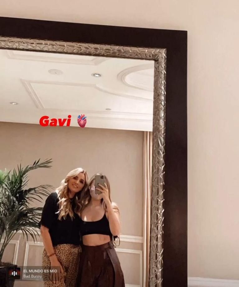 Regina posó frente al espejo mientras abraza a Angélica, quien lleva el cabello suelto y con ondas, una blusa negra y pantalón con estampado animal print.