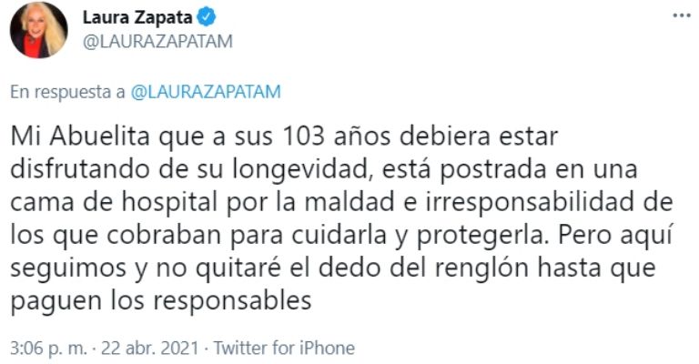 Ciudad de México.- Laura Zapata dio una triste noticia a través de sus redes sociales. Comunicó que su abuela, quien es también la de Thalía, ingresó al hospital en la capital, debido a que ya no toleraba el dolor.