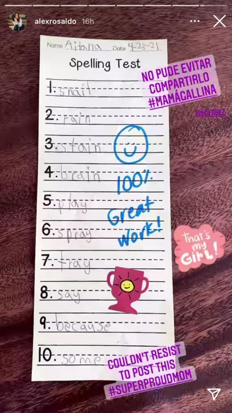 No pude resistirme a publicar esto. Mamá súper orgullosa", escribió Alessandra sobre la foto de la prueba de deletreo.