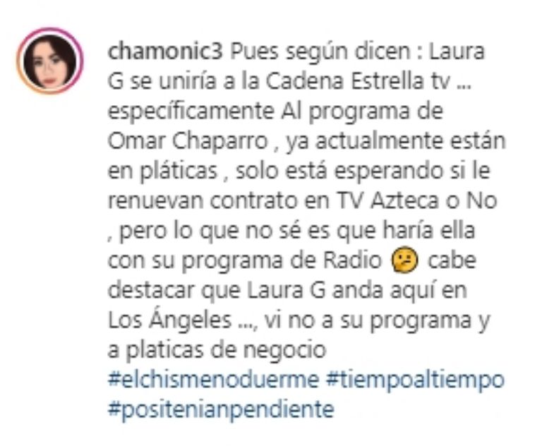 Sin embargo, destacó que Laura no volverá a Televisa, donde trabajó por muchos años, sino en realidad estaría en pláticas para unirse a la cadena Estrella TV donde actualmente labora su excompañero Omar Chaparro.