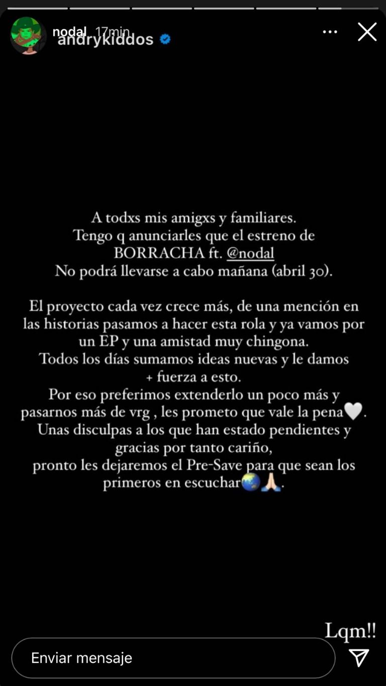 En una historia de Instagram se hizo saber que sería imposible lograr que Borracha saliera este viernes, debido a que todo inició por una simple mención que se realizó en redes sociales y como es tanto el público que puso la esperanza de algo realmente grande, decidieron tomarse el tiempo de extender para hacer que sea algo totalmente producido.