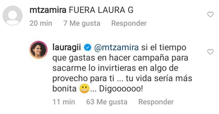 Si el tiempo que gastas en hacer campaña para sacarme, lo invirtieras en algo de provecho para ti... tu vida sería más bonita... ¡digo!", escribió 'La G'.