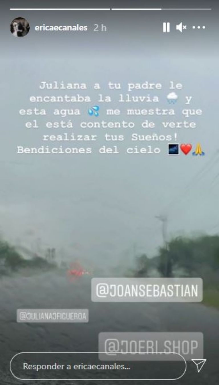 Juliana, a tu padre le encantaba la lluvia y esta agua me muestra que él está contento de verte realizar tus sueños. Bendiciones del cielo".