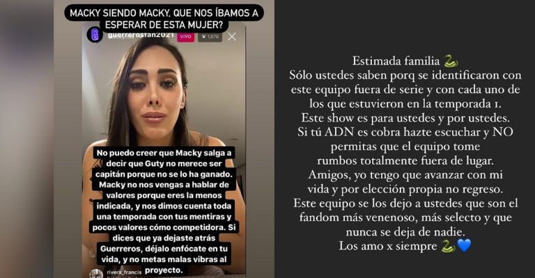La misma atleta compartió un mensaje en sus historias y explicó que ella no volverá al reality, sin embargo, sí le pidió al "team venenoso" que no permitan que el equipo tome un rumbo que no debe.