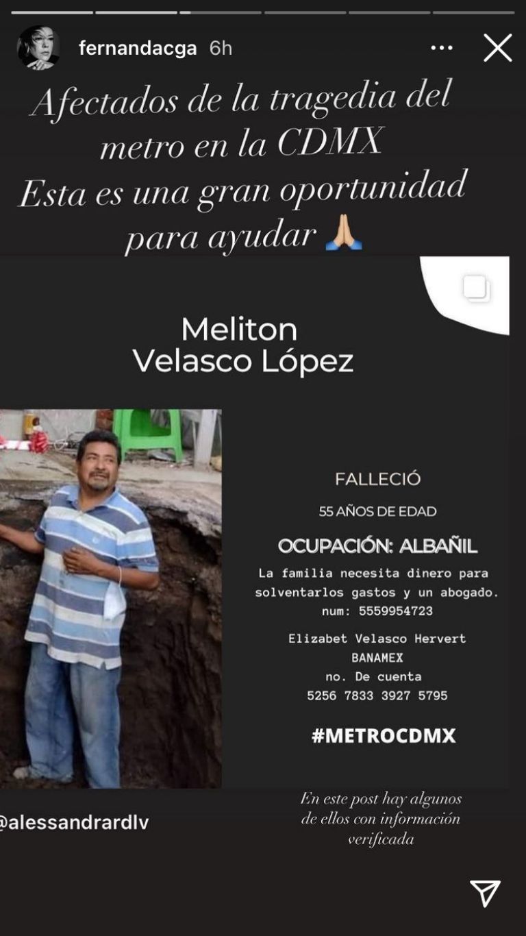 Ciudad de México.- Luego de la tragedia en la Línea 12 cambiara la vida de 25 familias, entre ellas, la de Meliton Velasco López, la actriz Fernanda Castillo pidió a sus seguidores en Instagram donativos de apoyo.