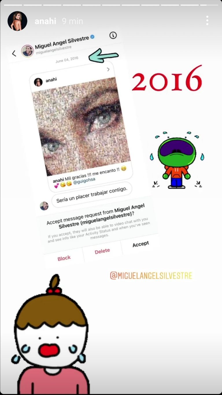 Acto seguido, la también actriz colocó la captura de pantalla con fecha del 2016 en la que Silvestre le expresa su admiración con el siguiente mensaje: