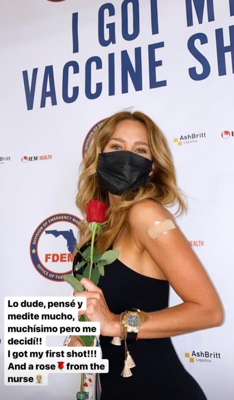 La artista mexicana aprovechó su cuenta oficial de Instagram para compartir una fotografía en la que aparece recién vacunada y hasta con una rosa en la mano que le regaló la enfermera que la atendió. Según explicó, se trata de la primera dosis.