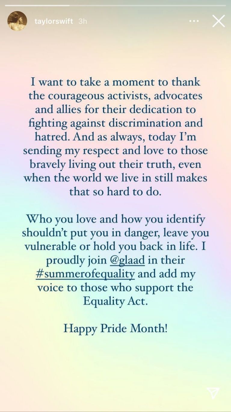 Quién amas y cómo te identificas no debería ponerte en peligro", agregó Swift. "Me uno con orgullo a GLAAD en el #summerofequality y sumo mi voz a los que apoyan la Ley de Igualdad. ¡Feliz Mes del Orgullo!".