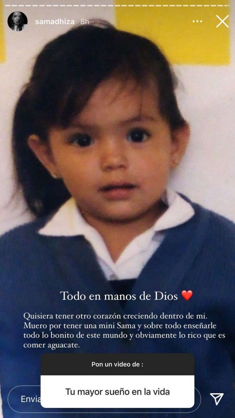 Quisiera tener otro corazón creciendo dentro de mi. Muero por tener una mini Sama y sobre todo, enseñarle todo lo bonito de este mundo y, obviamente, lo rico que es comer aguacate", escribió sobre una imagen de su infancia.