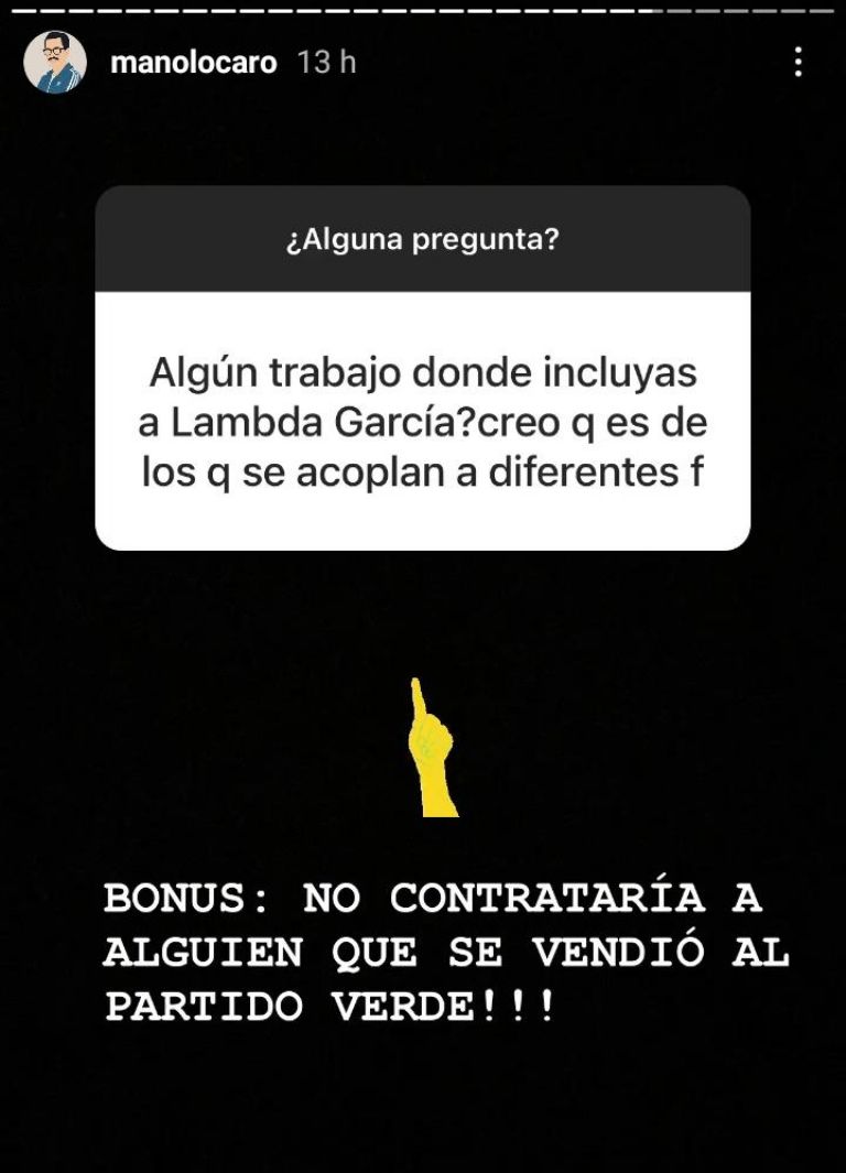 Durante una serie de preguntas y respuestas en su cuenta de Instagram, Manolo fue cuestionado sobre si incluiría en alguno de sus trabajos a Lambda y así respondió: