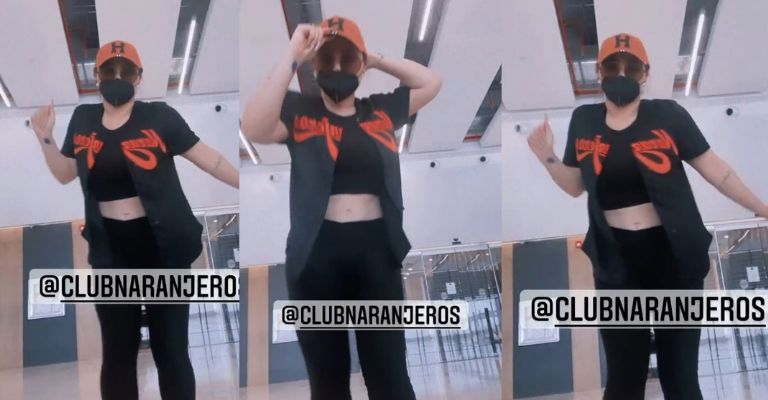 'Gomita' se grabó poco antes de abordar su avión y se dejó ver mostrando sus mejores pasos al ritmo del exitoso tema de La Brissa, La colaless, mientras lleva leggings de color negro, un top que permitió ver su abdomen plano y además la jersey de Naranjeros.