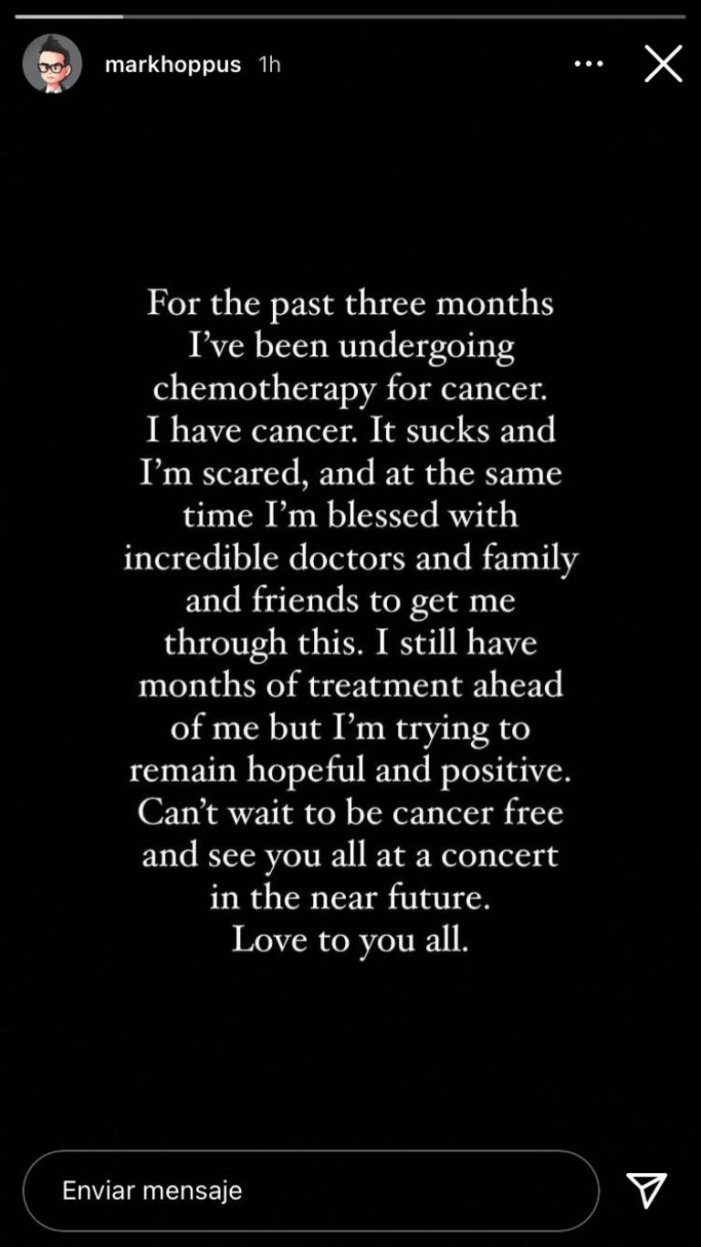 El músico compartió que tiene cáncer mediante un comunicado, el cual publicó en sus redes sociales, particularmente en sus historias de Instagram, hace unas horas.