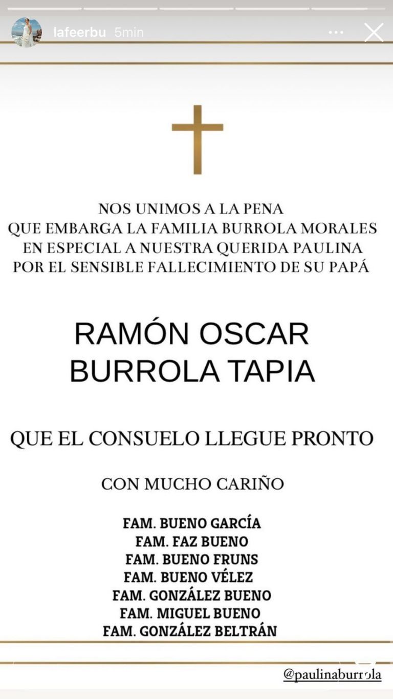 Nos unimos a la pena que embarga a la familia Burrola Morales, en especial a nuestra querida Paulina, por el sensible fallecimiento de su papá Ramón Oscar Burrola Tapia. Que el consuelo llegue pronto", se leía.