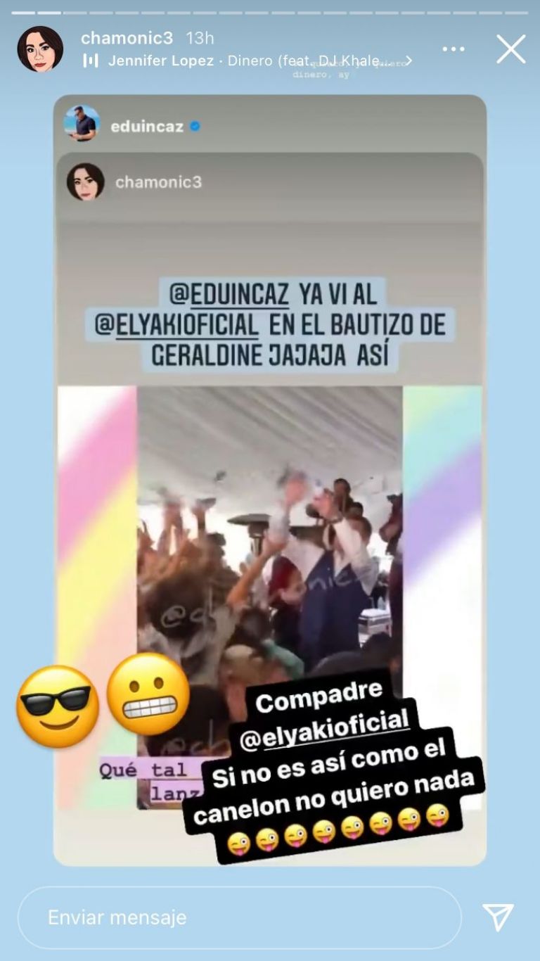 Quien no dudó en aprovechar la situación fue el cantante Eduin Caz, pues por medio de historias, en Instagram, resposteó las imágenes de 'Canelo' etiquetando a 'El Yaki' quien será el padrino de su bebé.