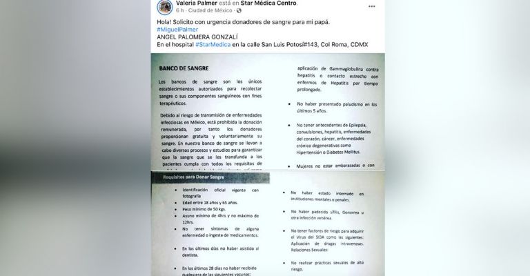 ¡Hola! Solicito con urgencia donadores de sangre para mi papá Miguel Palmer Ángel Palomera Gonzalí, en el hospital Star Medica en la calle San Luis Potosí #143, Col Roma, CDMX”, dijo.