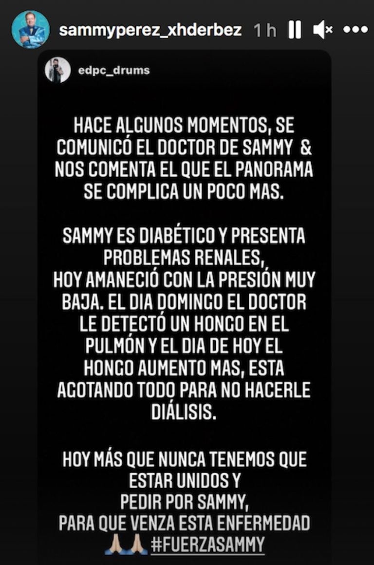 De acuerdo lo que informó De Paz en un comunicado publicado en historias de Instagram de Sammy, hace algunos momentos se comunicó el doctor del comediante y les informó que el panorama "se complica un poco más".