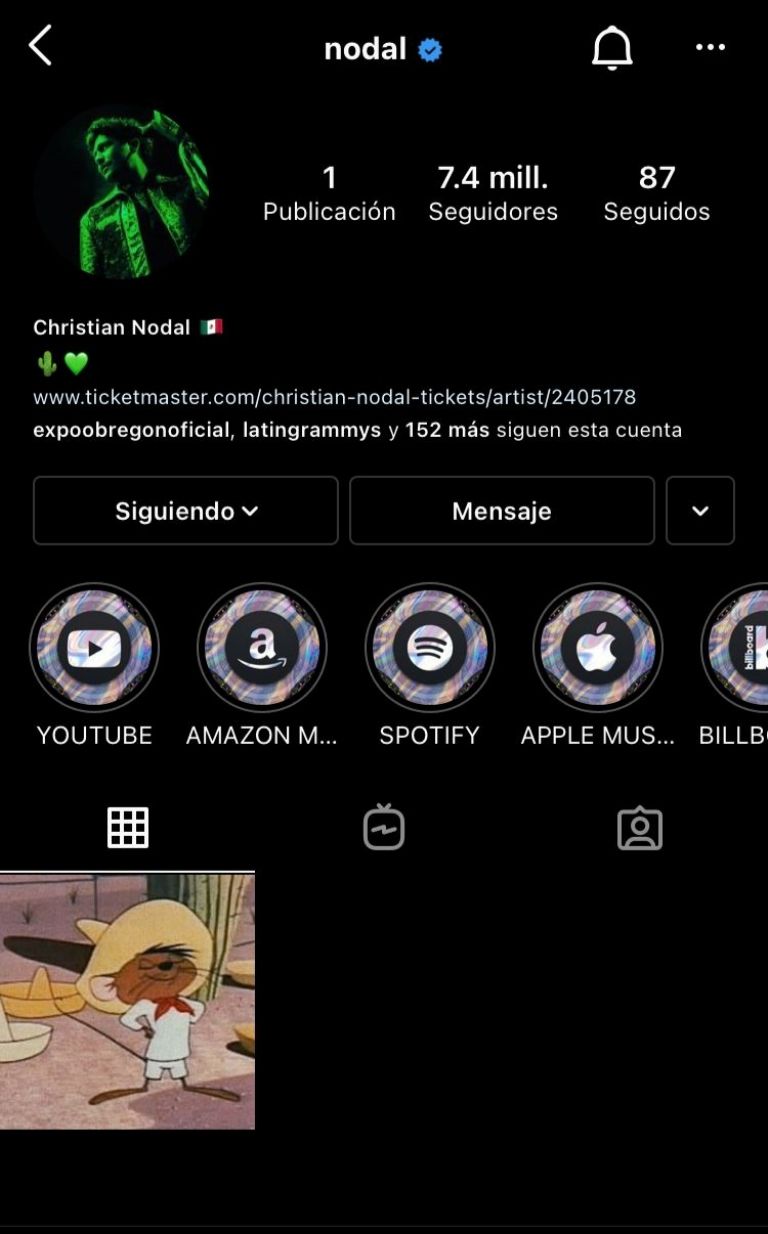 En la mencionada red social de la camarita donde ya cuenta con poco más de siete millones de seguidores quedó solamente una fotografía con el personaje animado Speddy González, con el cual el artista se identifica.